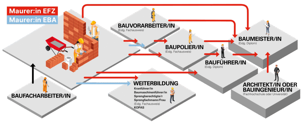 Als Maurer:in EBA kannst du zwei zusätzliche Lehrjahre machen und Maurer:in EFZ werden. Als Maurer:in EFZ stehen dir viele Karrierewege offen: