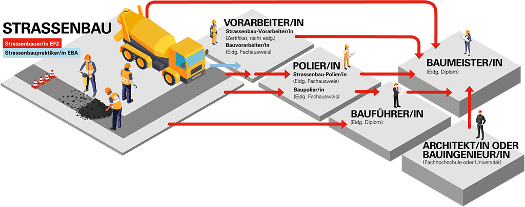 Als Strassenbaupraktiker:in EBA kannst du zwei zusätzliche Lehrjahre machen und Strassenbauer:in EFZ werden. Als Strassenbauer:in EFZ stehen dir viele Karrierewege offen: